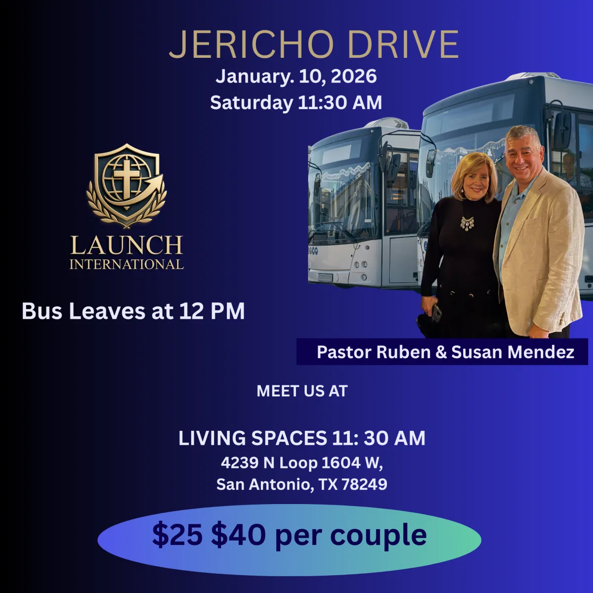 In general, the Jericho Drive will last approximately three and a half to four hours as we travel along Loop 1604. During this time, we will make four strategic stops to worship, declare God’s promises, and pray over each designated location. We warmly invite everyone to participate in this citywide prayer assignment, which will be conducted in a spirit of excellence, unity, and godly order.